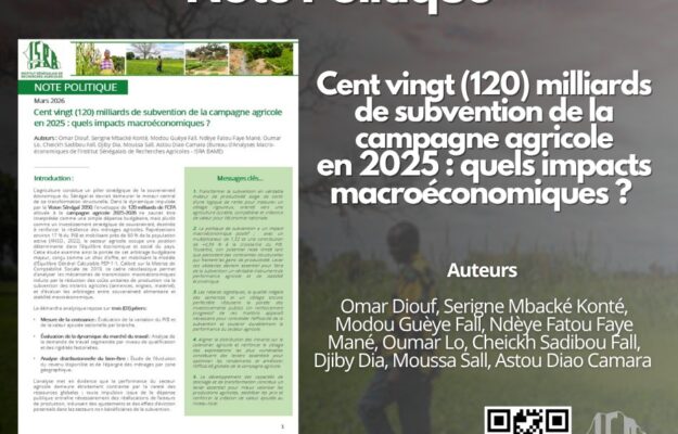 Élaborée en mars 2026 par une équipe de chercheurs composée notamment de Omar Diouf, Serigne Mbacké Konté, Modou Guèye Fall, Ndèye Fatou Faye Mané, Oumar Lo, Cheikh Sadibou Fall, Djiby Dia, Moussa Sall et Astou Diao Camara, cette analyse examine les impacts macroéconomiques des 120 milliards de FCFA alloués à la campagne agricole 2025 au Sénégal.Il constitue véritablement un investissement stratégique pour la souveraineté alimentaire