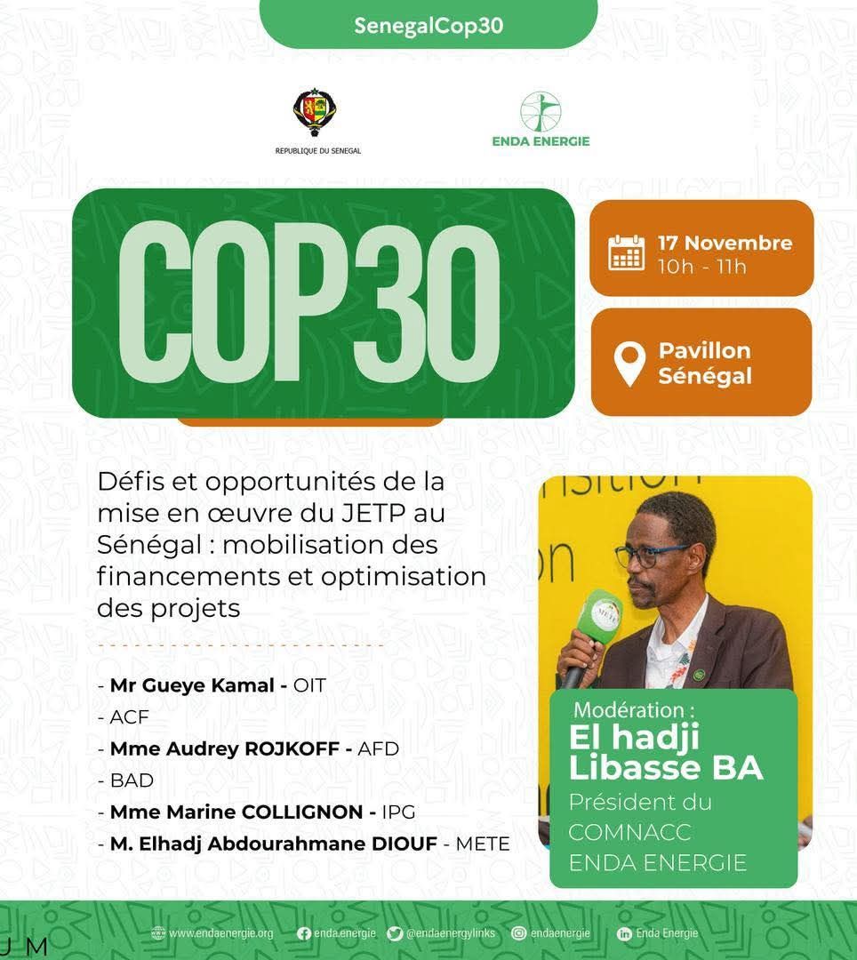 Le Sénégal organise, ce 17 novembre 2025 au pavillon national, un panel de haut niveau consacré au Partenariat pour une Transition Énergétique Juste (JETP) dans le cadre de la COP30 à Belém.La session sera modérée par El Hadji Libasse Ba, Président du COMNAC.Ce panel s’inscrit dans la dynamique de présentation du Plan d’Investissement du JETP, une feuille de route stratégique visant à :accélérer l’accès universel à l’énergie,renforcer la part des énergies renouvelables dans le mix électrique, garantir une transition juste, inclusive et durable pour le Sénégal.Un appel est lancé à toutes et à tous pour suivre ce panel de haut niveau consacré aux défis et opportunités liés à la mise en œuvre du JETP au Sénégal. Babaclimat COP 30 Belem2015-Bresil