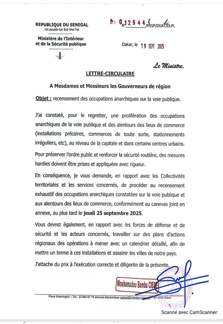 Mettre fin au désordre qui règne dans l’espace public, telle est l’ambition affichée par le ministre de l’Intérieur et de la Sécurité publique à travers une circulaire datée du 19 septembre et adressée aux gouverneurs de région. Le document prescrit le recensement des occupations anarchiques de la voie publique et engage les autorités administratives à assainir durablement les villes du pays.La problématique est bien connue :la mendicité, les charrettes, les motos-taxis « Jakarta », les garages de fortune, les marchés de rue, les ateliers de menuiserie, les laveurs de voitures, les parkings de vente de voitures, les vendeurs ambulants, les tabliers, les cordonniers, les coiffeurs de rue, les cafés « Touba » installés à même les trottoirs, sans oublier les dépôts sauvages d’ordures. Autant de pratiques qui encombrent la voie publique et perturbent la mobilité urbaine.Désormais, les forces de l’ordre sont instruites de veiller au respect de l’ordre et de la discipline, avec à la clé des sanctions contre les contrevenants. Une mesure que de nombreux citoyens disent applaudir, excédés par un désordre devenu quotidien et difficilement supportable.Les populations interrogées s’estiment très heureux d’apprendre cette nouvelle mais estiment cependant que cette opération ne doit pas se limiter à un « coup de poing » ponctuel. Elles plaident pour des actions régulières et pérennes, pilotées en synergie par le ministère, les gouverneurs, préfets et maires, afin d’éviter que l’anarchie ne reprenne ses droits.À Dakar, où les marchés de Dalifort, Grand-Yoff, Khar Yalla, Sacré-Cœur ou encore Ouakam sont pointés du doigt pour leur anarchie persistante, l’enjeu est particulièrement crucial. À l’approche des Jeux olympiques de la Jeunesse 2026, la capitale devra impérativement réussir ce chantier pour améliorer son cadre de vie et son image internationale.« Faire respecter la loi, l’ordre et la discipline, c’est réussir 90 % du projet porté par les nouvelles autorités », commente un observateur. Une initiative jugée salutaire, mais qui devra se traduire par un engagement ferme et constant pour produire des résultats durables.Babaclimat