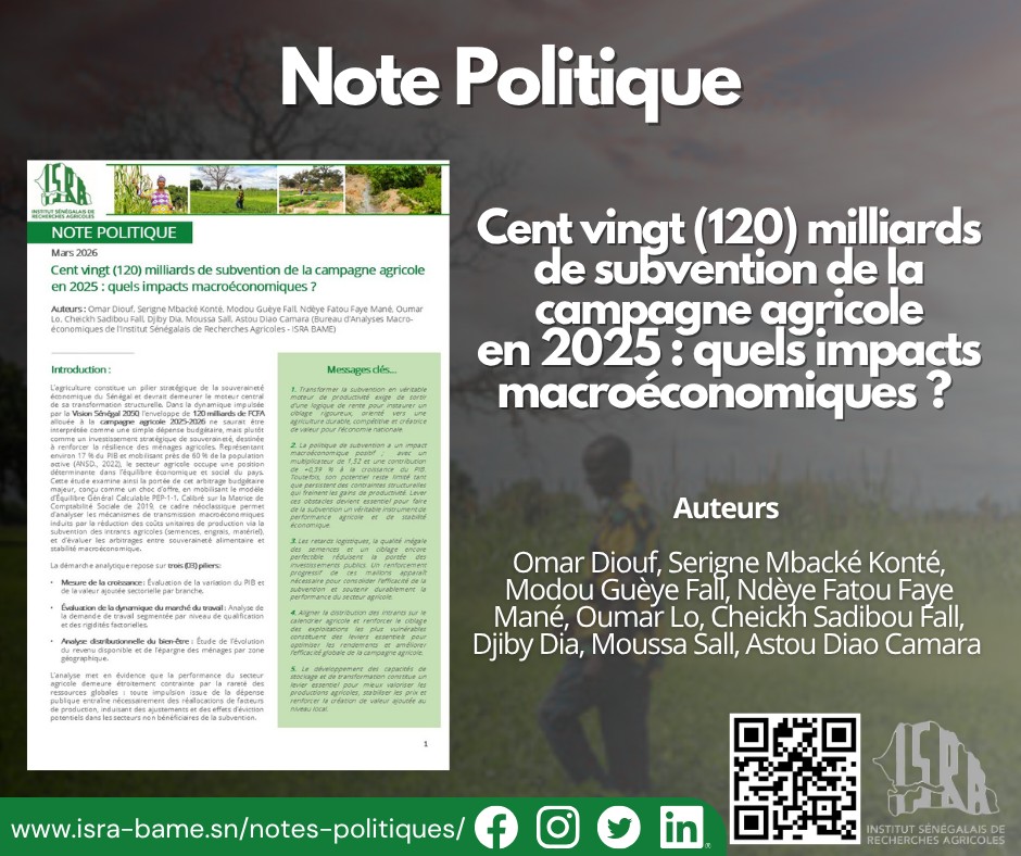 Élaborée en mars 2026 par une équipe de chercheurs composée notamment de Omar Diouf, Serigne Mbacké Konté, Modou Guèye Fall, Ndèye Fatou Faye Mané, Oumar Lo, Cheikh Sadibou Fall, Djiby Dia, Moussa Sall et Astou Diao Camara, cette analyse examine les impacts macroéconomiques des 120 milliards de FCFA alloués à la campagne agricole 2025 au Sénégal.Il constitue véritablement un investissement stratégique pour la souveraineté alimentaire